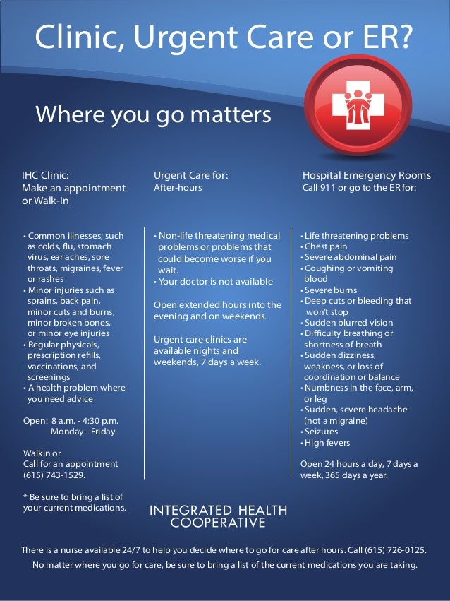 Is urgent care for emergencies only. In addition the cost of an emergency room visit can be up to 400 more than the cost of being seen in an urgent healthcare center. Urgent care is a form of medical care that focuses on conditions that are not potentially life- or limb-threatening emergencies but still require prompt care within 24 hours or less Timothy. Hospital emergency rooms are not the place to go for common illnesses or minor injuriesIf you are experiencing any of the following symptoms dont wait.